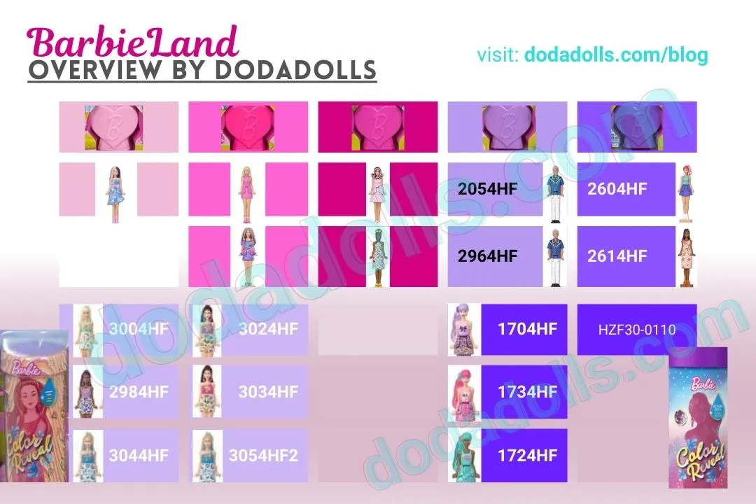 Unlike with the regular Color Reveal Barbies, the number codes are not corresponding to the dolls’ order at the bottom of the packaging. Additionally, I discovered something very interesting with one lilac Color Reveal package: it had one code on the lid and a different code on the bottom of the box — something to be aware of.