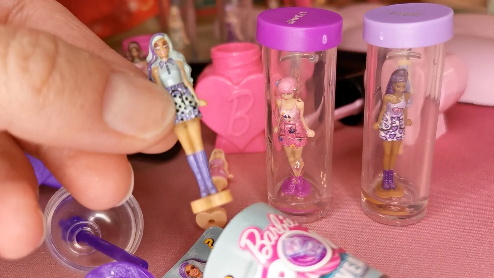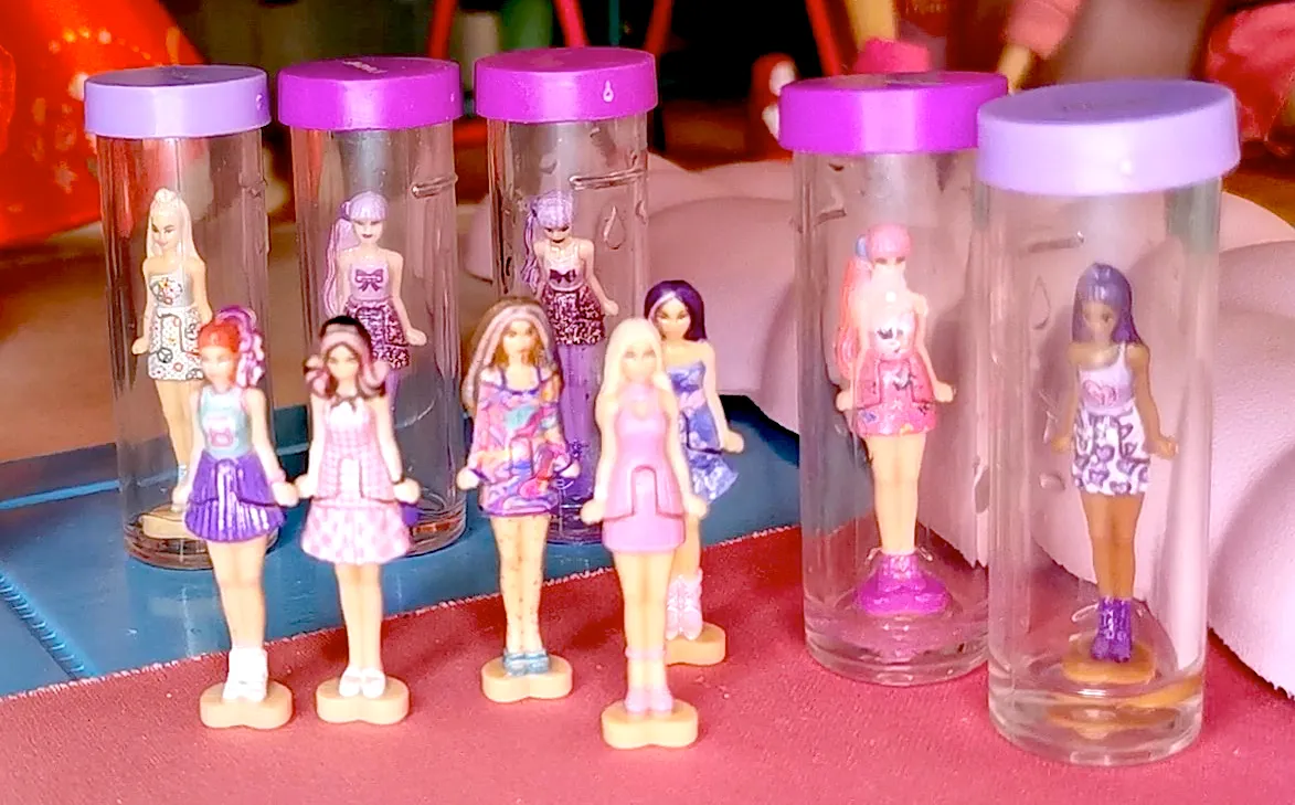 Inside, the dolls are covered with dissolvable metallic paint (just like their real-life-sized Barbie counterparts). They all have the same shape, so it’s very hard to distinguish beforehand which one you got, making the reveal a real surprise. Sometimes, the bottom of the shoes is visible or less covered by the paint, so you may catch a glimpse of their shoe color from below.